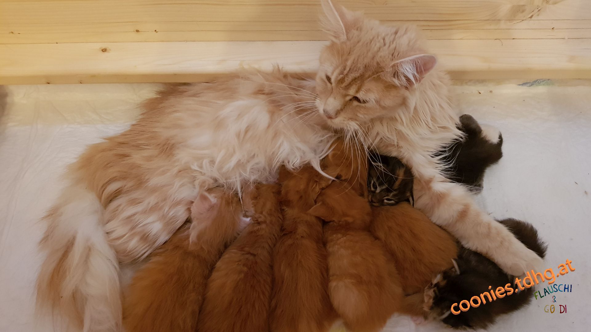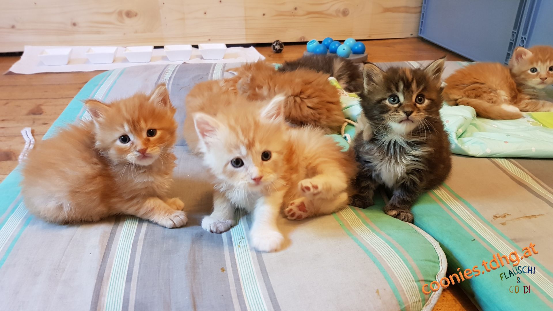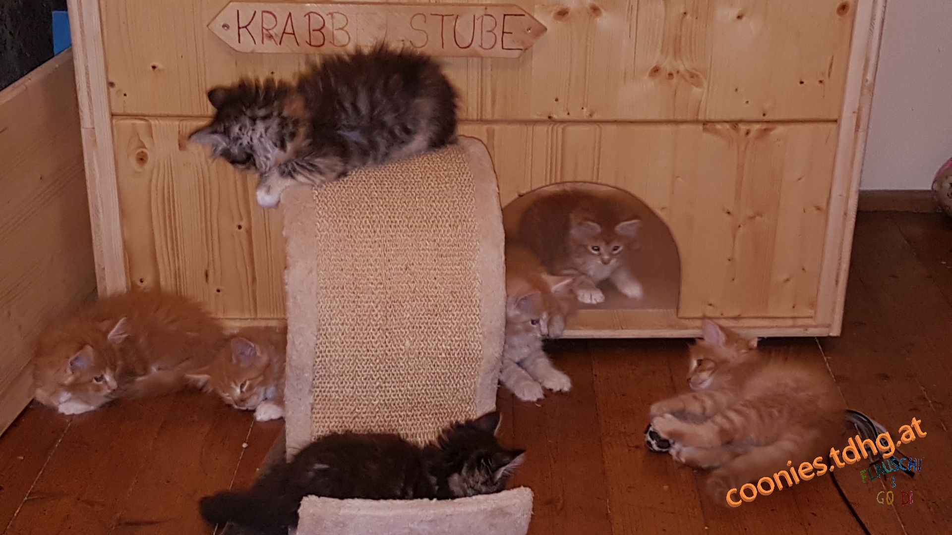 - 7 Kitten, sie entwickeln sich prächtig, wir haben 2 Mädels (black tabby) und 5 Jungs (creme, red).