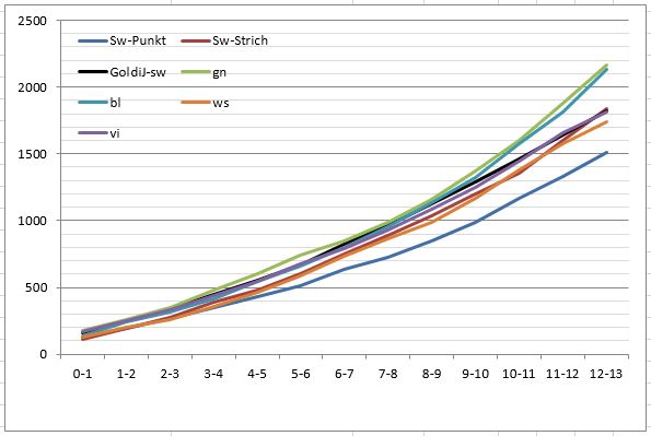 Diagramm zeigt das Gewicht in Gramm in Abhängigkeit des Alters in Wochen der Kitten. Die Wochenwerte sind die gemittelten Tageswerte.