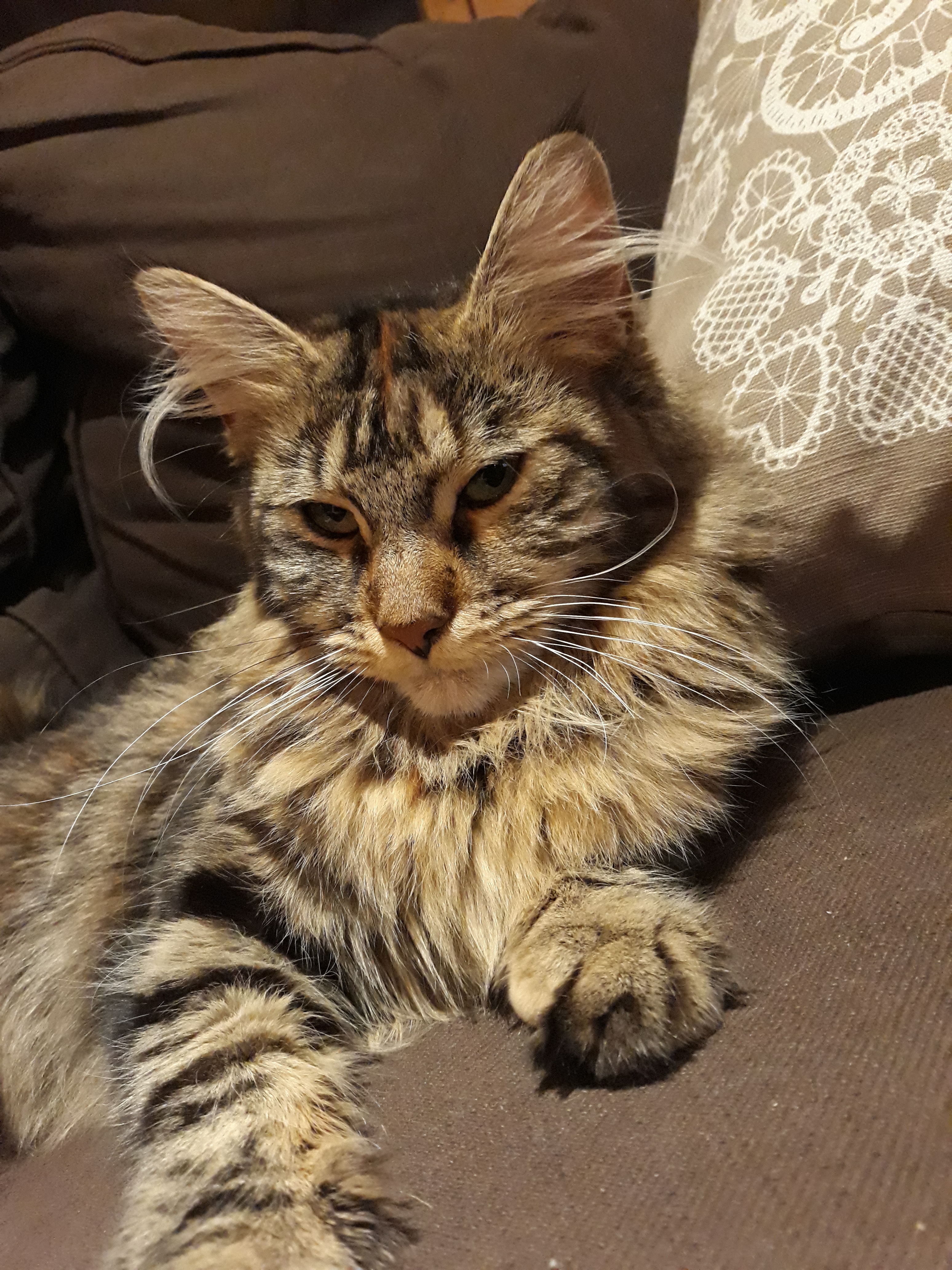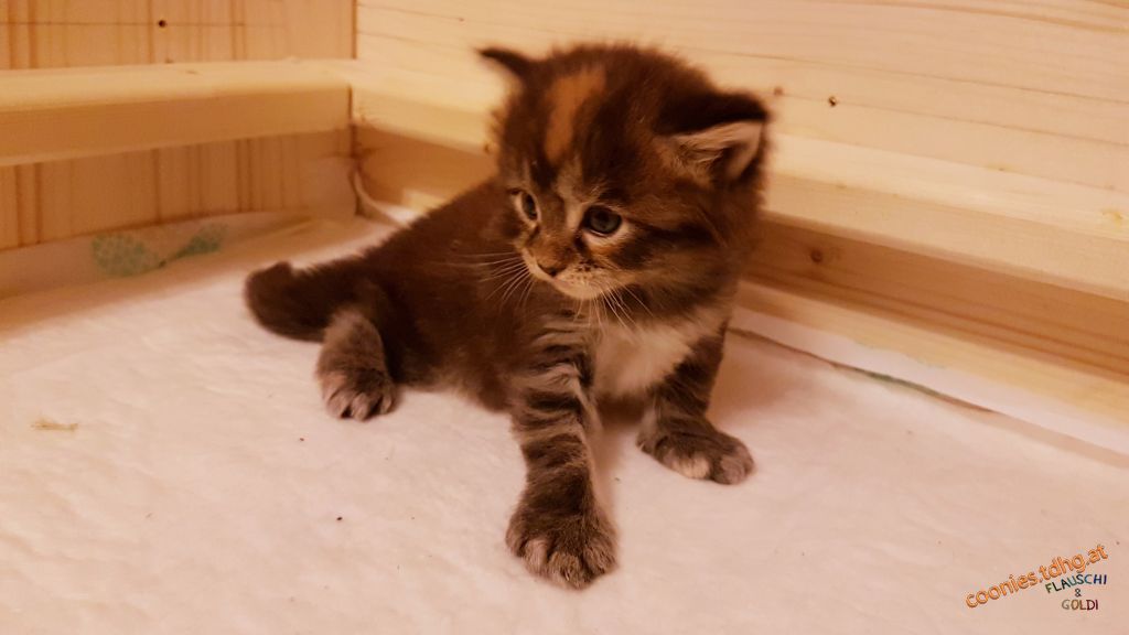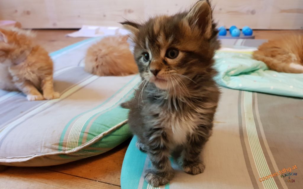Aussehen: roter Punkt auf der Stirn, graue Pfoten, weißer Bauch mit zwei grauen Streifen, symmetrisches Gesicht, weiß um die Augen, leichte Büschel an den Ohren Charakter: Ich bin sehr verspielt und verschmust. |