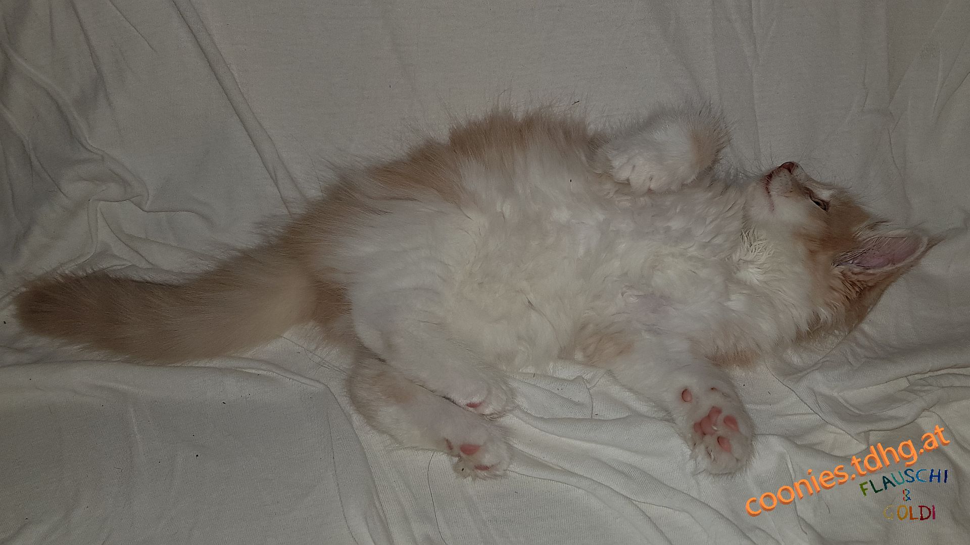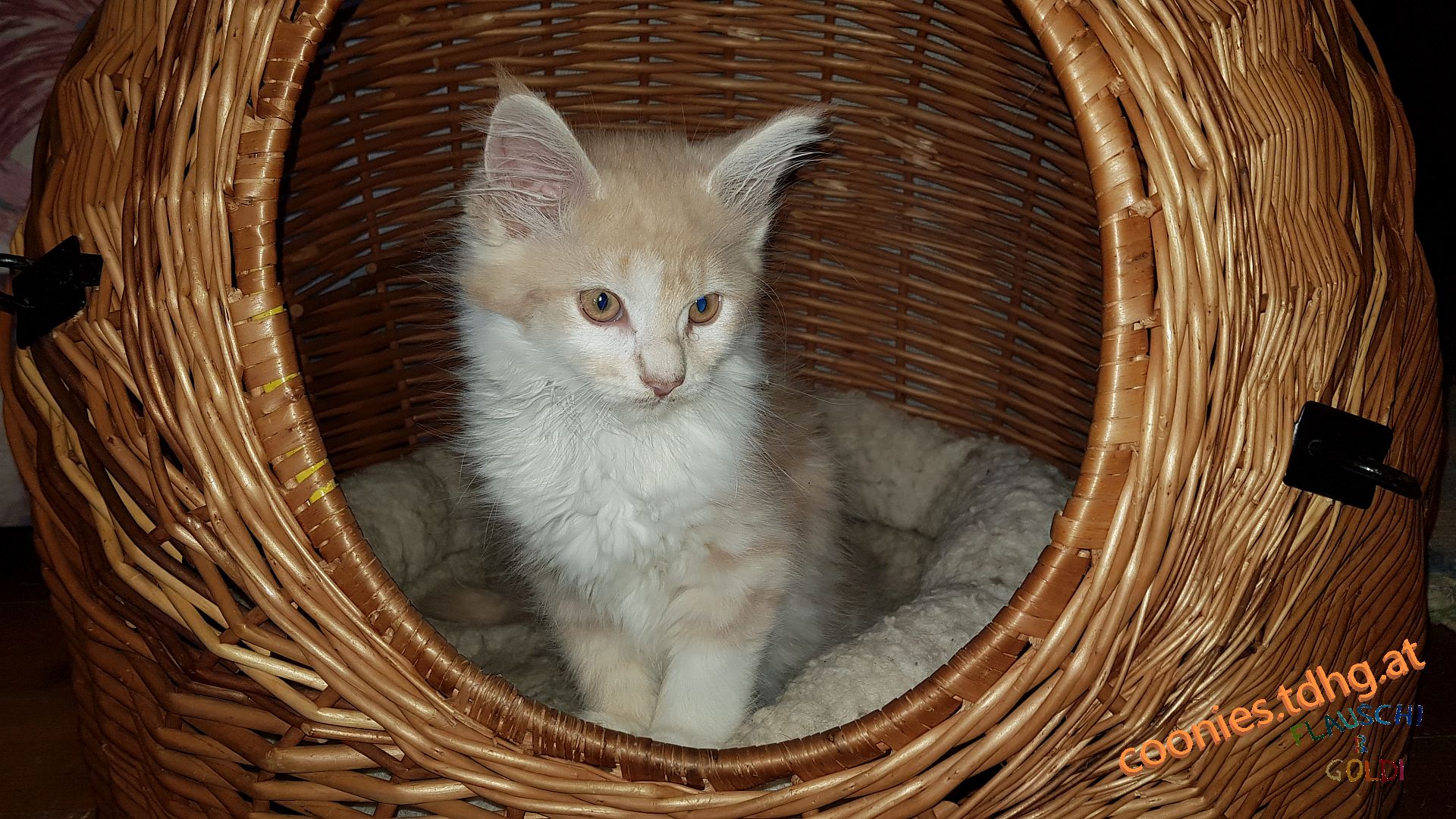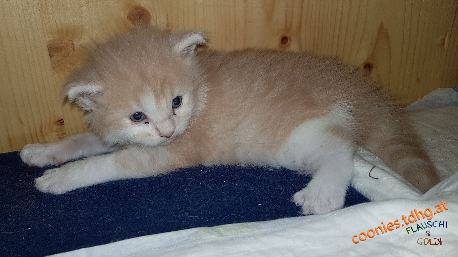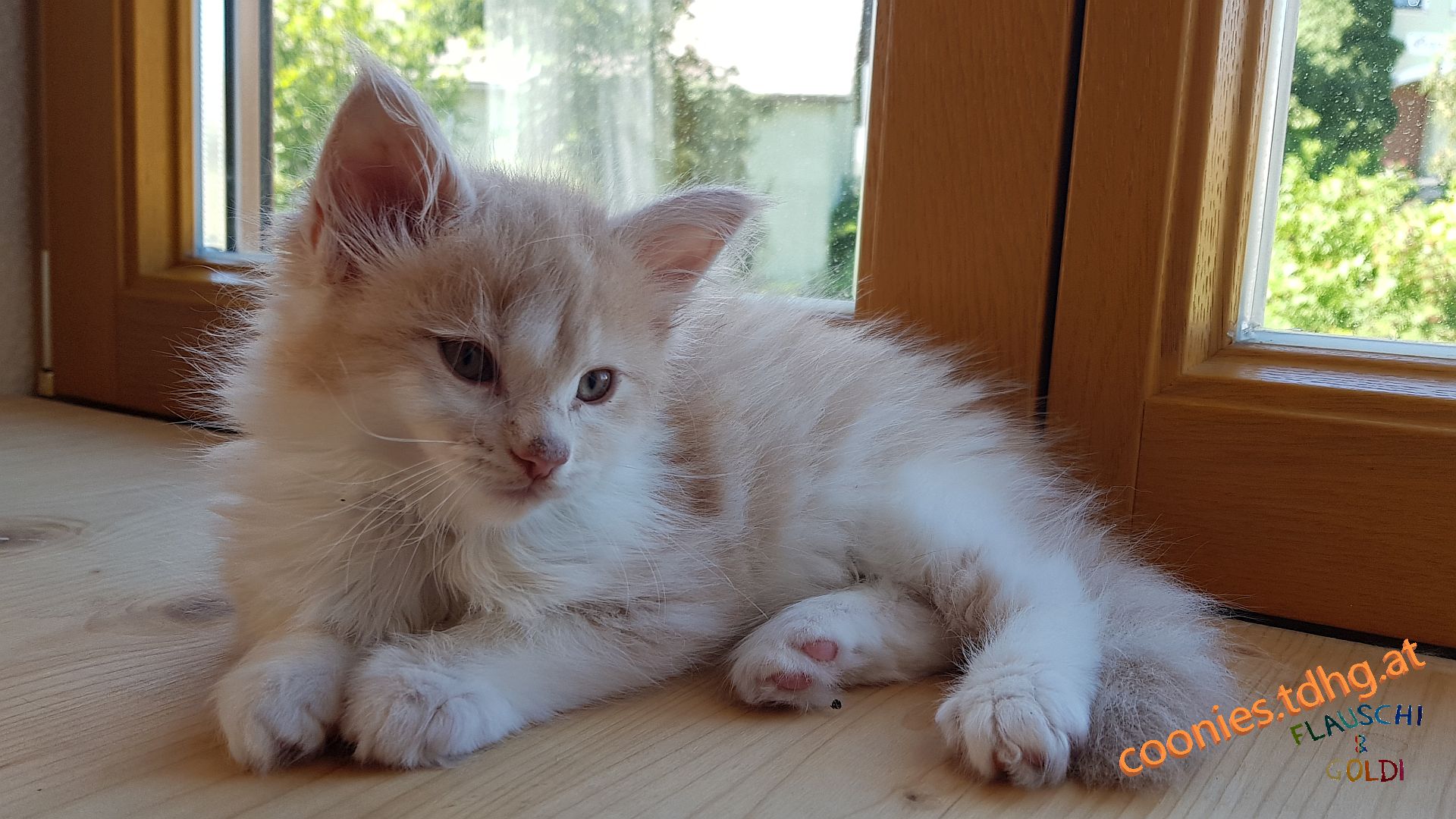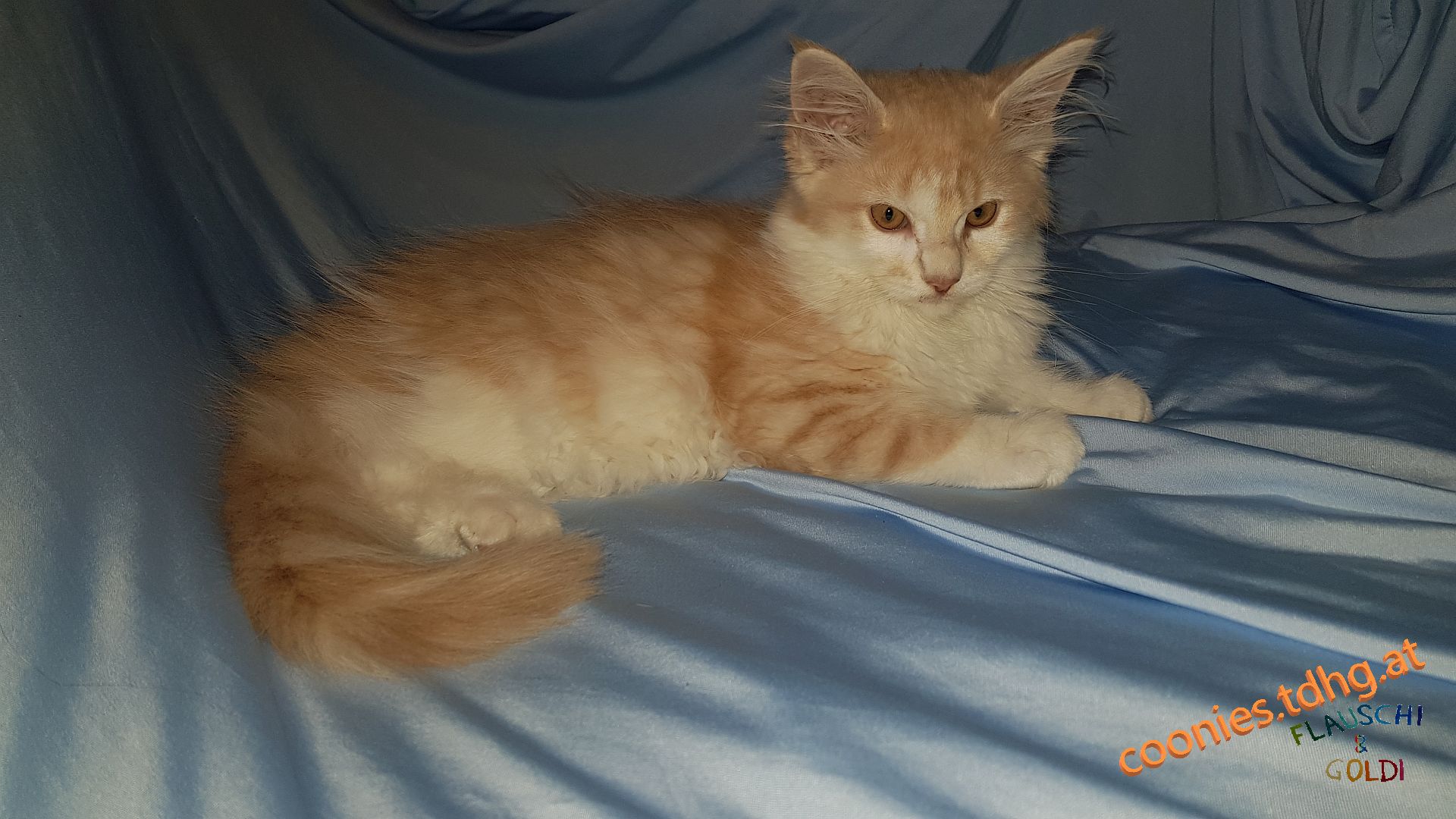 Aussehen: chremiges Fell, weiße Pfoten und Hinterbeine, Vorderbeine creme-rot geringelt, weißer Bauch Charakter: Ich bin ein wenig ruhiger als Fleury eher wie mein Bruder Blacky. Mit ihnen spielen tue ich aber sehr gerne ... |