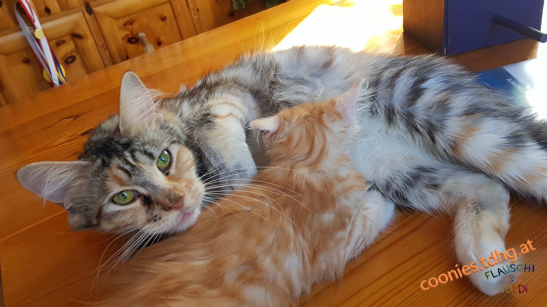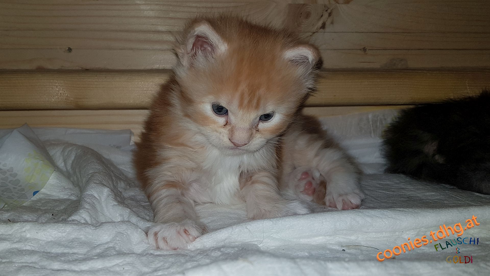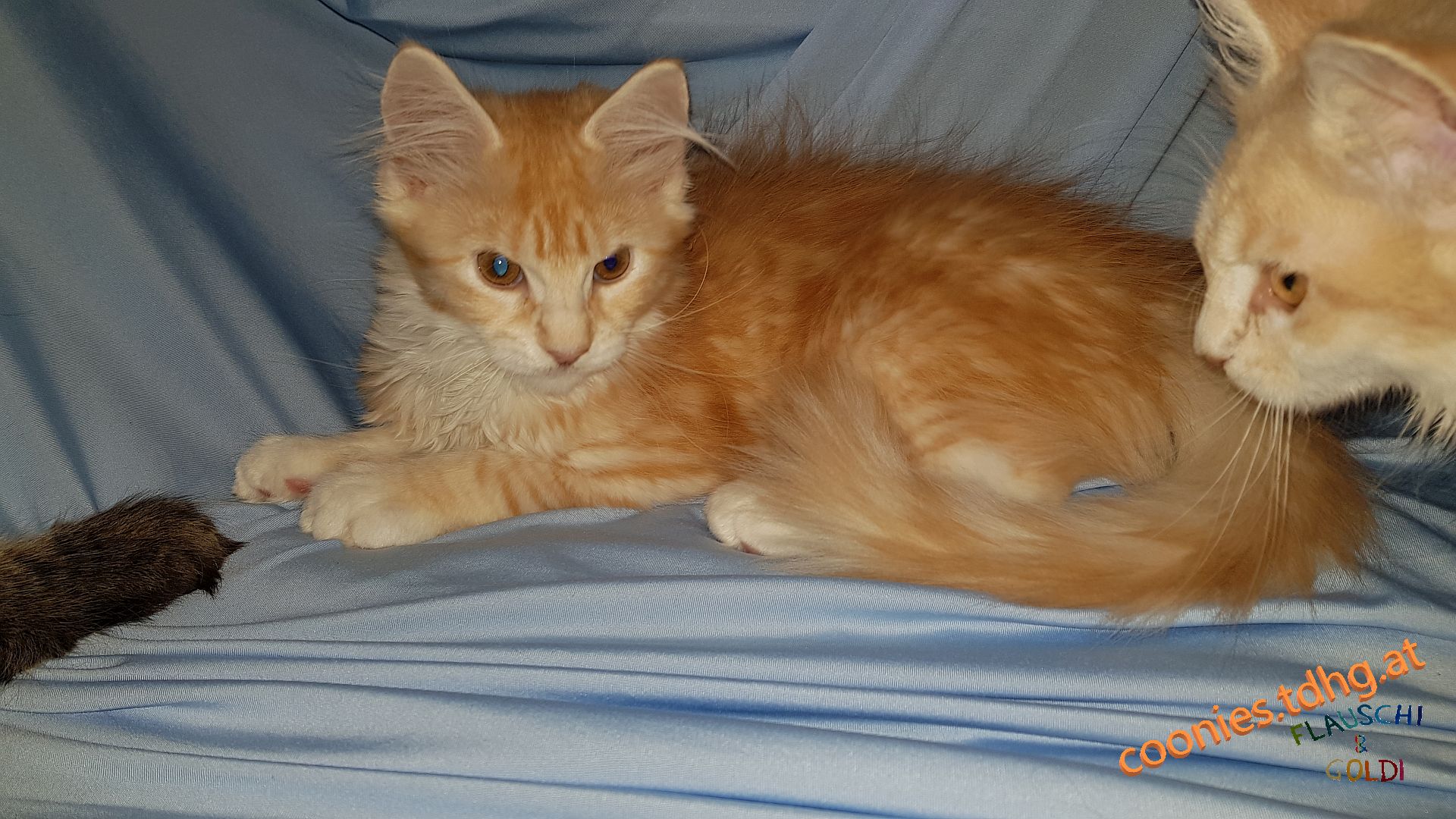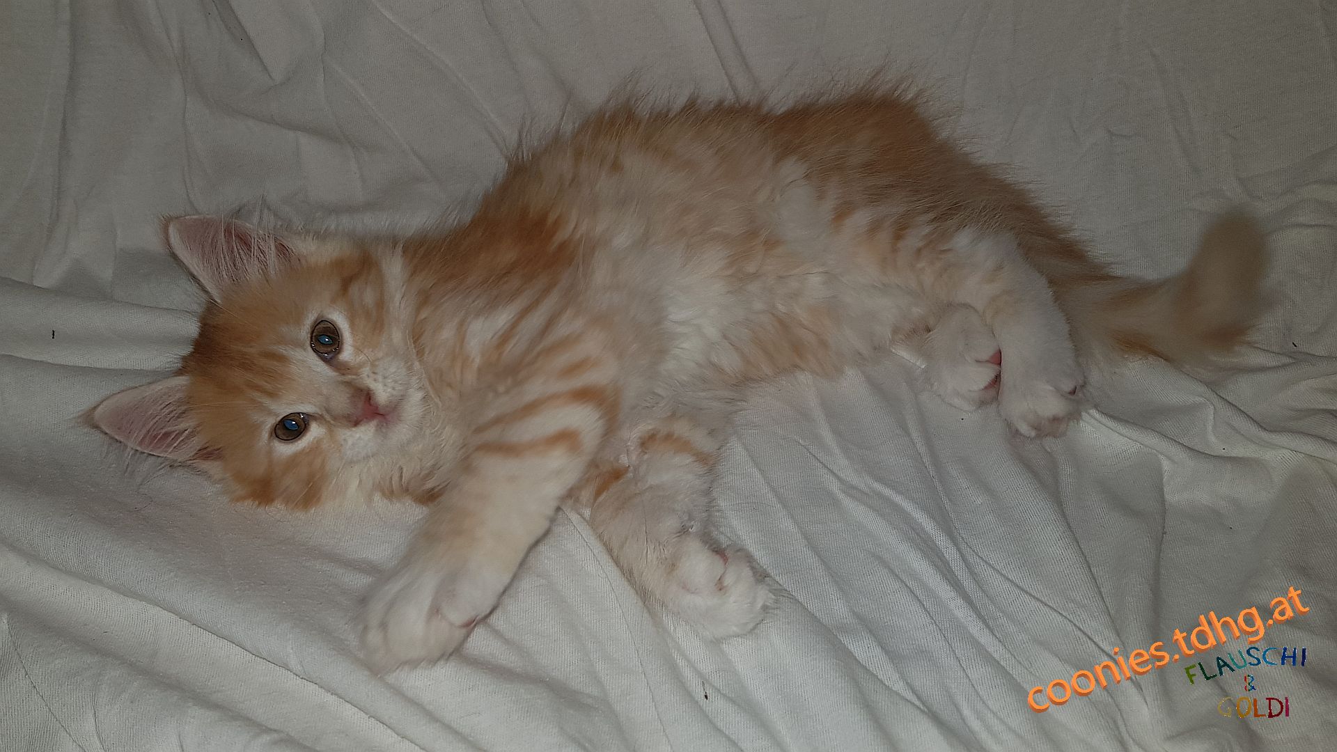 Aussehen: rötliches Fell, weiße Pfoten und Hinterbeine, Vorderbeine rot geringelt, weißer Bauch Charakter: Ich bin der lebhafteste von uns und auch derjenige, der am schnellsten bei der Tür hinaus ist, wo man mich aber leider immer gleich wieder einfängt .... |